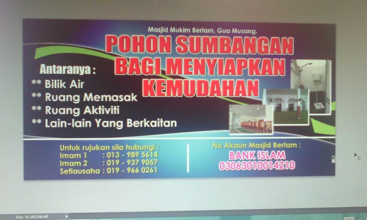 Pihak Masjid Mukim Bertam, Kg. Bertam Baru memohon sumbangan dari semua pihak dalam menyiapkan kemudahan di Masjid Mukim Bertam. Segala pertanyaan dan nombor akaun adalah seperti berikut: